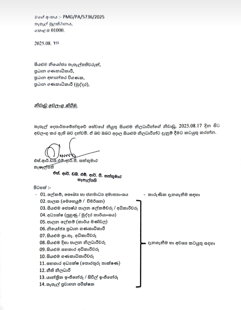 The Post Master General has issued a circular cancelling the leave of all Postal Department employees from 17-08-2025.