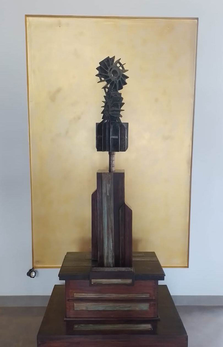 Sarath Chandrajeewa’s Motion and stillness 2023 (Height 150cm, Bronze mounted on wooden structure) – Ayuda Centre of Healing, Thalahena, Sri Lanka