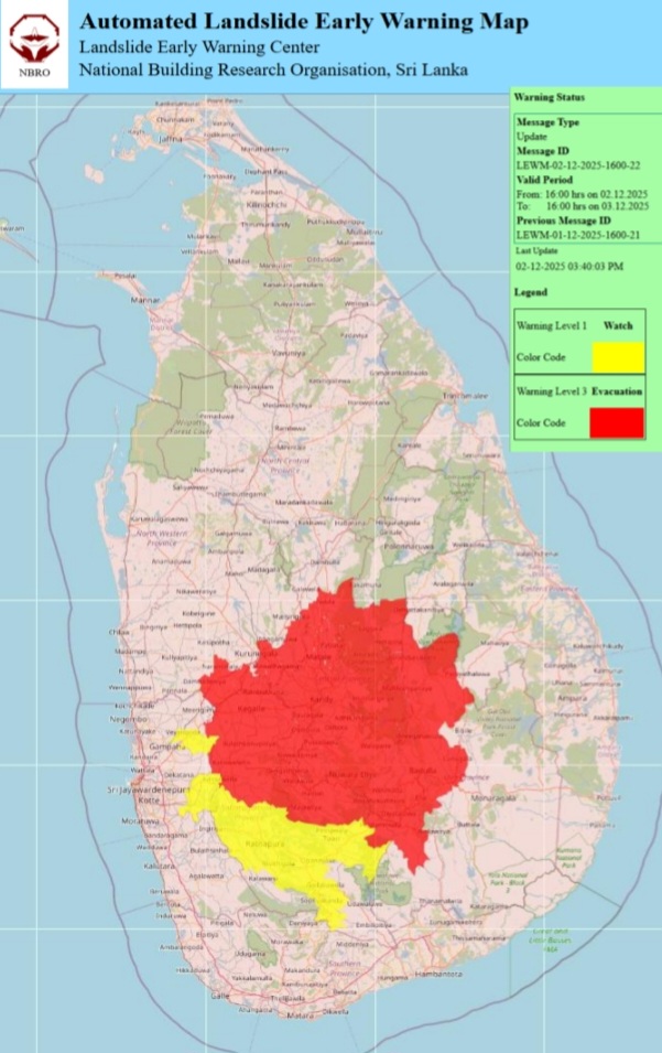 The landslide early warning centre of the National Building Research Organization (NBRO) has issued landslide early warnings to the districts of Badulla, Colombo, Gampaha, Kandy, Kegalle, Kurunegala, Matale, Nuwara-Eliya and Ratnapura from 16:00 hrs on 02.12.2025 To 16:00 hrs on 03.12.2025