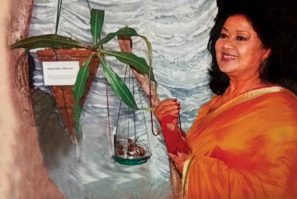 Clad in a pulsating orange sari, Malini Senehelatha Fonseka, the quintessential Queen of Sinhala cinema blended in perfect harmony with Nepenthes Malani-when a new cultivar of Nepenthes (Pitcher plant) or Bandura, as it is locally known, was named in her honour more than ten years ago.