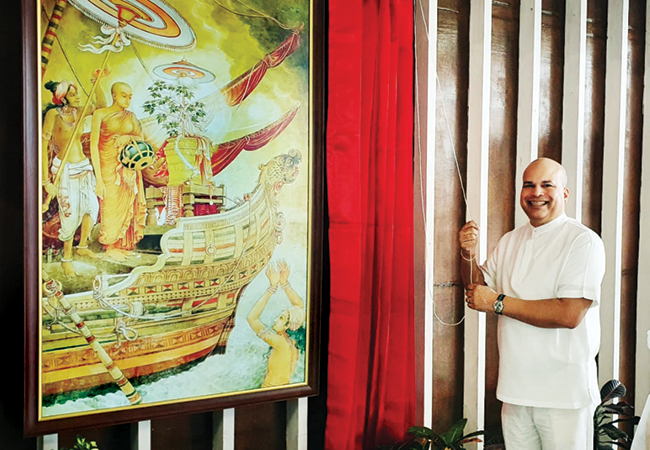 Moragoda was in Gujarat on a two-day official visit to meet state officials and potential investors, a news release said.The prominently displayed photos in the Ahmedabad airport, feature pictures of two Solias Mendis murals from the Kelaniya Rajamaha Vihara. The first depicts Arahat Mahinda, delivering the message of the Buddha to King Devanampiyatissa while the second depicts the arrival to Sri Lanka of Theri Sanghamitta, bearing the right-hand branch sapling of the Sri Maha Bodhi tree.