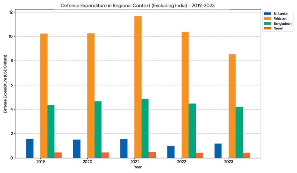 When compared with the regional counterparts, Sri Lanka’s defence financing appears modest and strategically limited. Between 2010 and 2025, Sri Lanka’s annual budget allocations foe defence, ranged from US$1.0 to US$2.0 billion, a figure small in comparison to the substantial military budgets of neighbouring states.