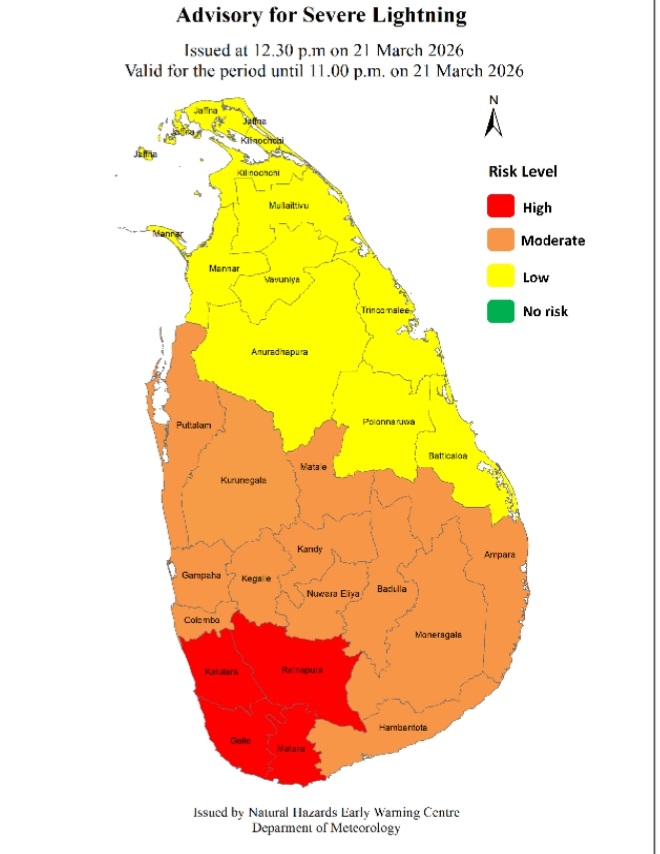Advisory for Severe Lightning Issued by the Natural Hazards Early Warning Centre Issued at 12.30 p.m. 21 March 2026, valid for the period until 11.00 p.m. 21 March 2026