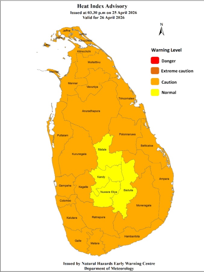 The Heat index, the temperature felt on the human body is likely to increase up to ‘Caution level’ at some places in the Northern, North-central, North-western, Western, Sabaragamuwa, Southern, and Eastern provinces and in Monaragala district during the day time.