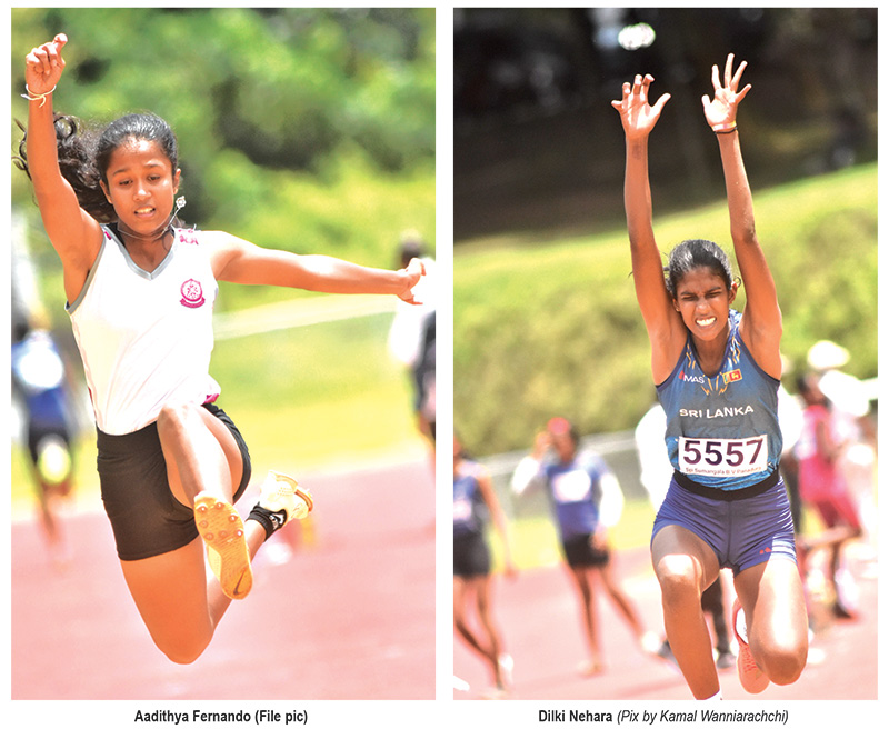 Sri Sumangala Girls School Panadura lasses Dilki Nehara and Aadithya Fernando bagged the titles of both horizontal jumps in the Under 20 and Under 18 age categories of the Athletics Championship of the Western Province Schools Games now in progress at Diyagama.