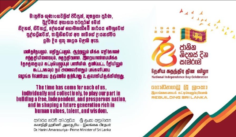 Prime Minister Dr Harini Amarasuriya in her Indepencence Day message invited all Sri Lankans to stand united with renewed confidence and determination, and to join in the shared task of shaping a new era of national renewal.