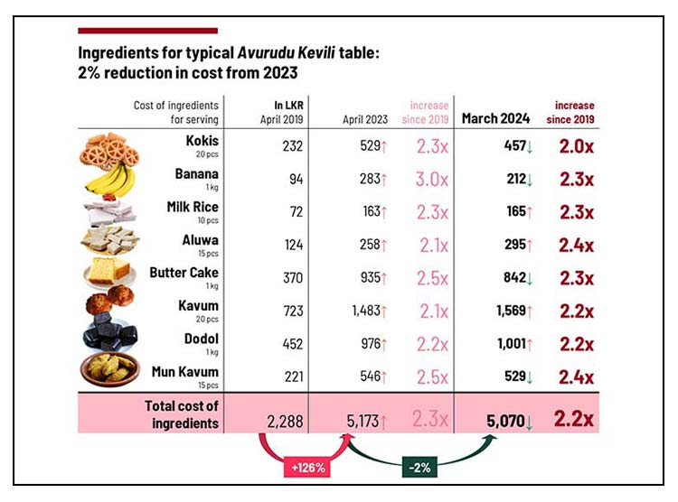 The cost of assorting a traditional kevili table for the Sinhala and Tamil New Year has gone down in 2024 compared to 2023, but remains more than twice as high as it was in 2019.
