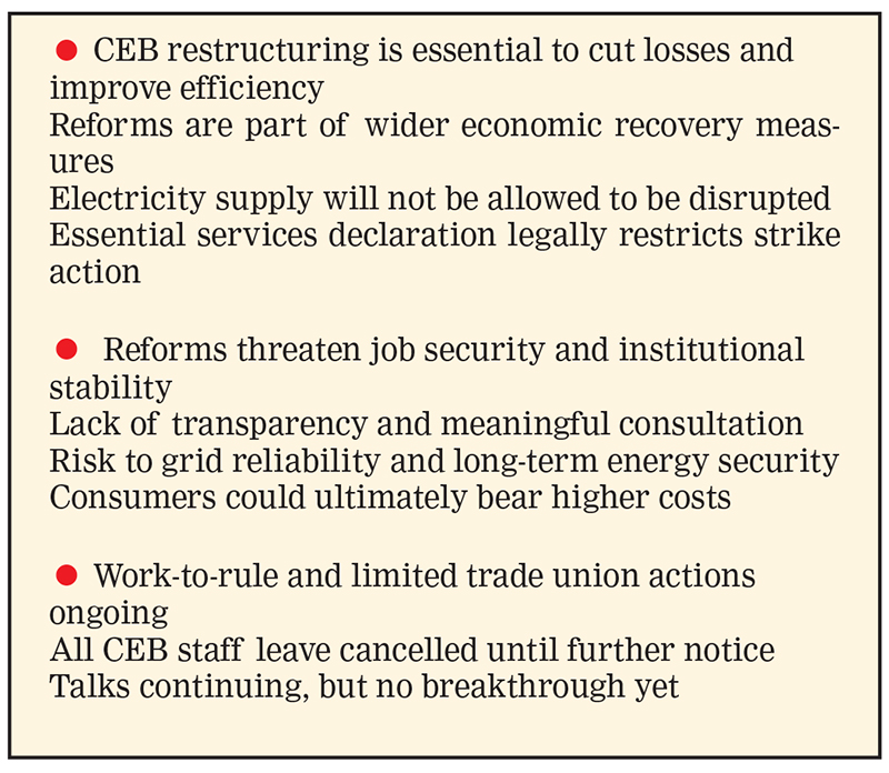 The dispute centres on the government’s determination to restructure and unbundle the CEB under amendments to the Electricity Act, a reform drive officials describe as unavoidable to curb losses, strengthen governance and stabilise the national power sector. This has also been a long-standing demand of international donors, particularly the International Monetary Fund and the World Bank.