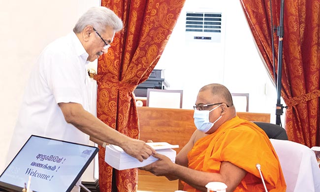 President Gotabaya Rajapaksa receiving a copy of the task force report from Ven. Galagodaatte Gnanasara. (pic courtesy PMD)