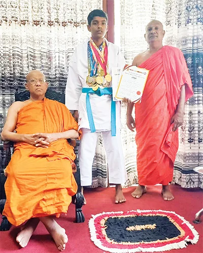 Here Matheesha Pabasara pose with Ven. Panakawe Premarathana thero and Mawussagolle Dhammarakkhitha thero.
