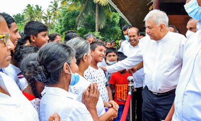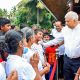 President Ranil Wickremesinghe shares a light moment with a group of people at the Weheragoda, Purana Viharaya, Sedawatta, on Sunday (24). The new President received the...