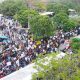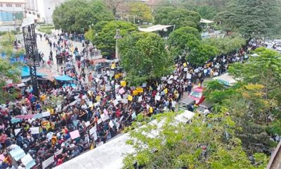 ProtestErs marching along the Dalada Veediya, Kandy yesterday shouting slogans and carrying placards asking the government to resign immediately . Pic by Cyril Wimalasurendre