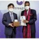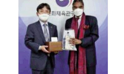 Vice Minister Kim Jeongbae with Dr. Mendis exchanging gifts after the formal meeting at the Ministry of Culture, Sports and Tourism Ambassador Dr. A. Saj U....