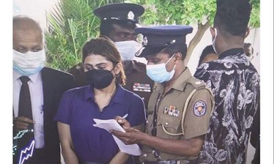 Actress Piumi Hansamali, make-up artist Chandimal Jayasinghe and others at the Colombo Magistrate court yesterday after being enlarged on bail for the offence of violating quarantine...
