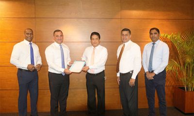 Handing over the agreement by Anthony Watson – Country Manager Sri Lanka and Maldives at Visa ( second from left ) to Lakshman Silva, CEO DFCC...