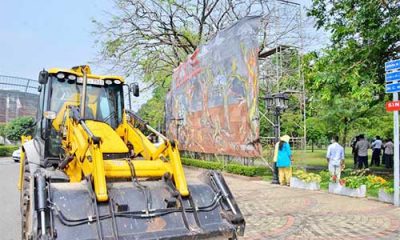 The Colombo Municipal Council yesterday pulled down a billboard, environmentalists had put up near the Nelum Pokuna theatre, Colombo, against environmental degradation, The billboard was created...