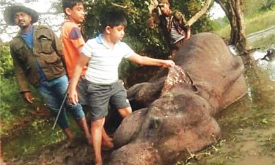 Children and wildlife officers inspecting a she elephant killed by an improvised explosive device, called hakkapatas, at Herathgama, in Kurunegala, on Monday. by Ifham Nizam Elephant...