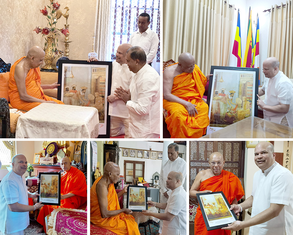 On the occasion, Moragoda presented framed reproductions of a well-known mural painting from the Kelaniya Raja Maha Vihara to the Mahanayake Theros. The painting, by renowned artist Solias Mendis, depicts the historic event of King Keerthi Sri Rajasinghe conferring the title of Sangharaja on the Venerable Weliwita Sri Saranankara Thero and symbolises the longstanding close relationship between Sri Lanka’s rulers and the Maha Sangha.