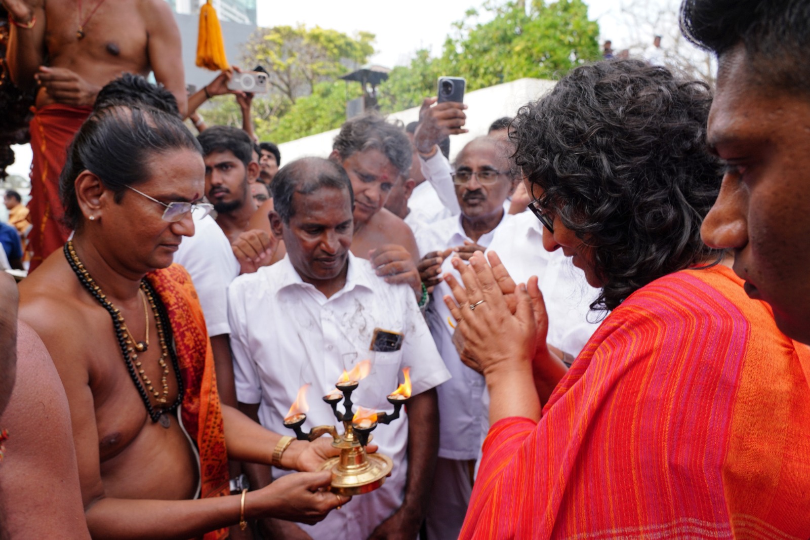 On the occasion of the annual Aadi Vel Festival of the Shri Kathirvelayuthaswamy Kovil in Sammankodu Colombo, Prime Minister Dr. Harini Amarasuriya participated in a special religious pooja conducted by ven. Ramesh Kurukkal on a special platform set up in front of Temple Trees, invoking blessings for the Prime Minister and the country. After the blessing ceremony, the Prime Minister was ceremonially escorted back to Temple Trees by the festival’s organizing committee.