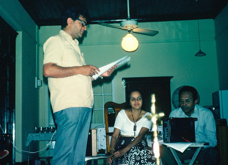 Others will discuss in some detail the classical and modern repertoire of Western plays that Mac directed for Stage & Set and the 27 plays he wrote himself, some of which are published, so that here I just want to suggest the sense of excitement a Stage & Set production would create through the media. I recall how characters in Mac’s production of Othello wore costumes made of Barbara Sansoni’s handloom material crafted specially for it and also the two sets of lead players, Irangani and Winston Serasinghe and Shelagh and Chitrasena. While Serasinghe’s dramatic voice was beautifully textured, Chitrasena with his dancer’s elan brought a kinetic dynamism not seen in a dramatic role, draped in the vibrant cloaks made of the famous heavy handloom cotton, with daring vertical black stripes – there was electricity in the air. Karan Breckenridge as the Story Teller in the Chalk Circle and also as Hamlet, Alastair Rosemale-Cocq as Iago were especially remarkable actors within the ensemble casts of Stage & Set. When Irangani and Winston Serasinghe, (an older and more experienced generation of actors than the nucleus of Stage & Set), joined the group they brought a gravitas and a sense of deep tradition into the group as Irangani was a trained actor with a wonderful deep modulated voice rare on our stage. The photographs of the production are enchanting, luminous moments of Lankan theatre. I had a brief glimpse of the much loved Arts Centre Club (watering hole), where all these people galvanised by theatre, – architects, directors, photographers, artists, actors, musicians, journalists, academics, even the odd senator – all met and mingled and drank and talked regularly, played the piano on a whim, well into the night; a place where many ideas would have been hatched.
