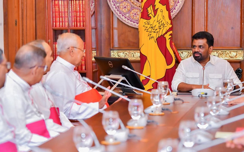 A meeting was held on Wednesday (20) morning at the Presidential Secretariat between His Eminence Malcolm Cardinal Ranjith, Archbishop of Colombo, the members of the Catholic Bishops’ Conference of Sri Lanka (CBCSL) and President Anura Kumara Dissanayake.