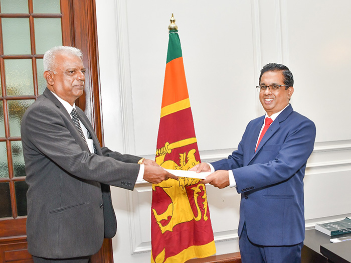 AVM (Retd) Sampath Thuiyakontha accepting his letter of appointment from Presidential Secretary Dr Nandika Kumananyake yesterday