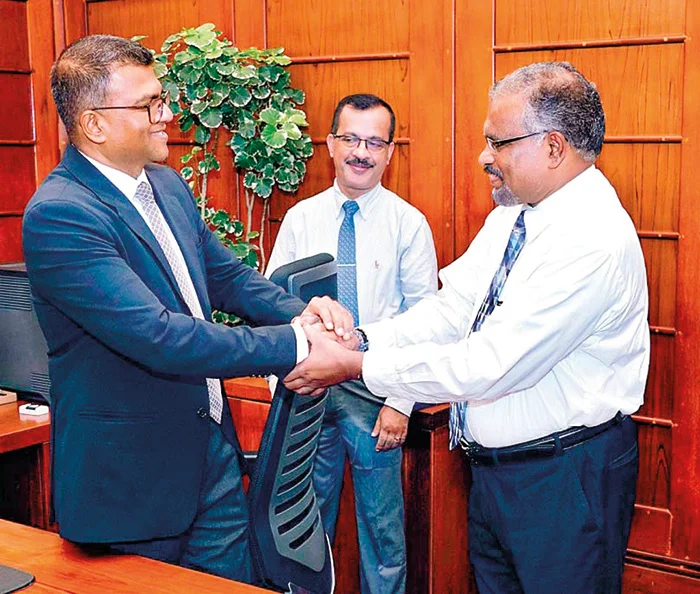 Outgoing Treasury Chief Mahinda Siriwardena congratulates his successor Harshana Suriyapperuma in late June 2025 at the Finance Ministry