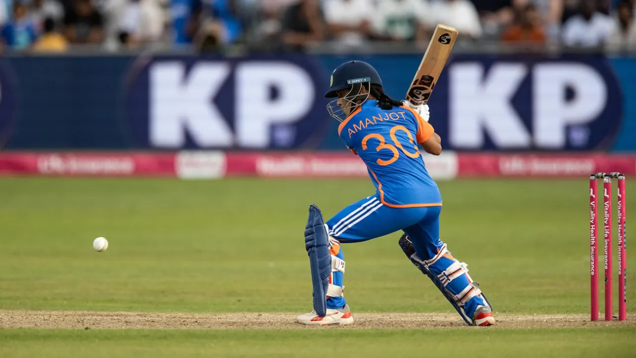 Batting as high as No. 5 for the first time, allrounder Amanjot showed considerable poise throughout her innings. She had one early boundary – chipping Smith over mid-off to bring cheers from the India supporters in the crowd – and was 18 off 18 balls before tucking into Ecclestone, England’s premier spinner.