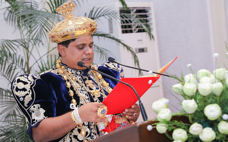 Accompanied by the Nilames of the Sathara Maha Dawala and the Pitisara Dewala, the Diyawadana Nilame of the Sri Dalada Maligawa Pradeep Nilanga Dela, arrived at the President’s House in a ceremonial procession. The Diyawadana Nilame was formally received and warmly welcomed by President Wickremesinghe at the main gate of the premises.