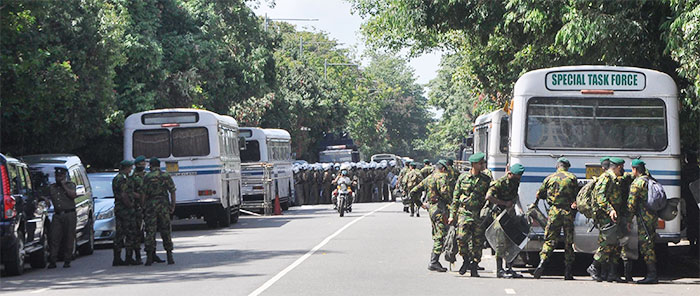 The government yesterday reinforced security at the Parliament complex fearing protests ahead of today vote to elect the next President. Thushara Atapattu captured troops arriving in the morning. However, the anticipated protests did no take place.
