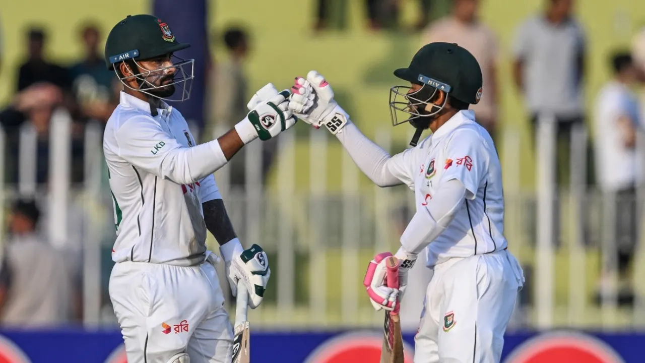 Bangladesh 316 for 5 in 92 overs (Shadman Islam 93, Mushfiqur Rahim 55*, Litton Das 52*, Mominul Haque 50; Khurram Shahzad 2-47) trail Pakistan 448 for 6 dec in 113 overs [Saim Ayub 56, Saud Shakeel 141, Mohammad Rizwan 171*, Shaheen Sha Afridi 29*; Soriful Islam 2-77, Hasan Mahmud 2-70] by 132 runs