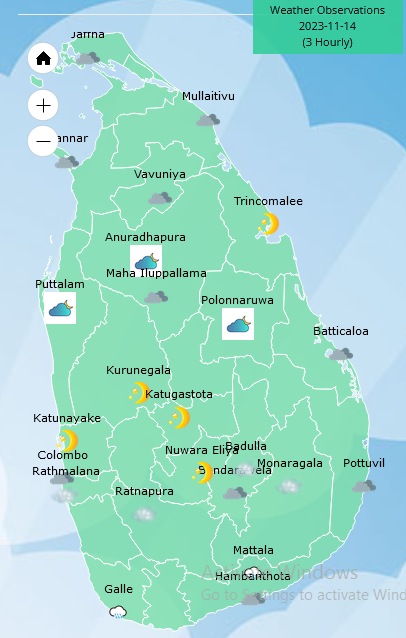 Showers or thundershowers will occur at times over the coastal areas of Northern, North-Western, Western and Southern provinces. Showers or thundershowers will occur at several places elsewhere over the island after 02.00 p.m. Fairly heavy showers above 75mm are likely at some places in Western, Sabaragamuwa, Southern, Central, North-central and Northern provinces.