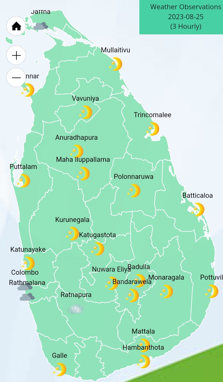 Showers or thundershowers will occur at a few places in Uva province and in Ampara, Batticaloa and Polonnaruwa districts during the evening or night