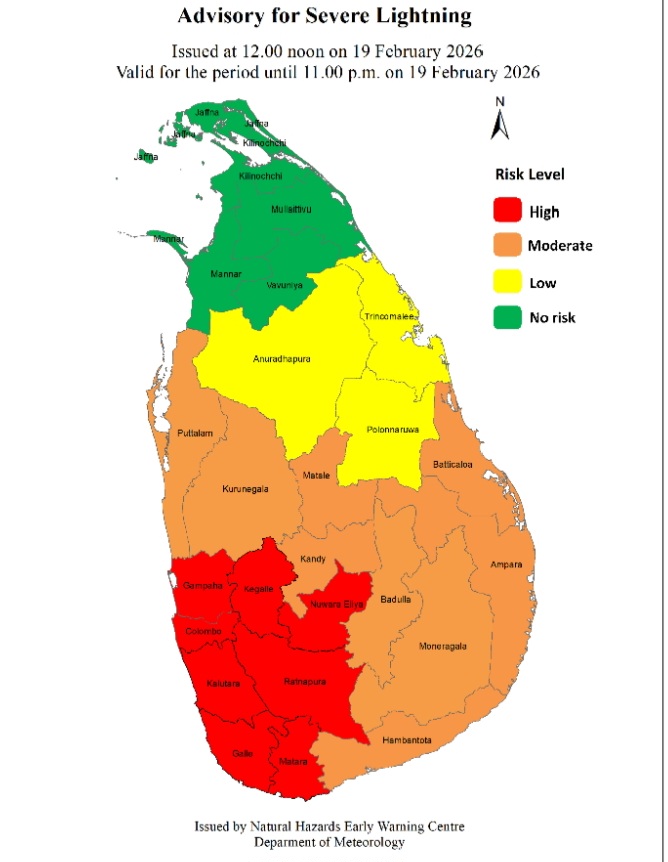 Advisory for Severe Lightning issued to the Western and Sabaragamuwa provinces and Nuwara-Eliya, Galle and Matara districts