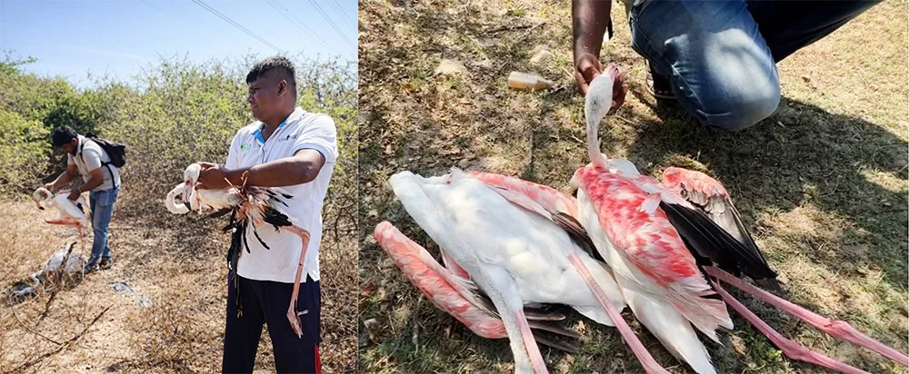 At least two flamingos—believed to be part of the iconic migratory flocks that travel thousands of kilometres to reach Sri Lanka—were found dead after entanglement with high-tension transmission lines running across the sanctuary. Another bird was reportedly struggling for survival.