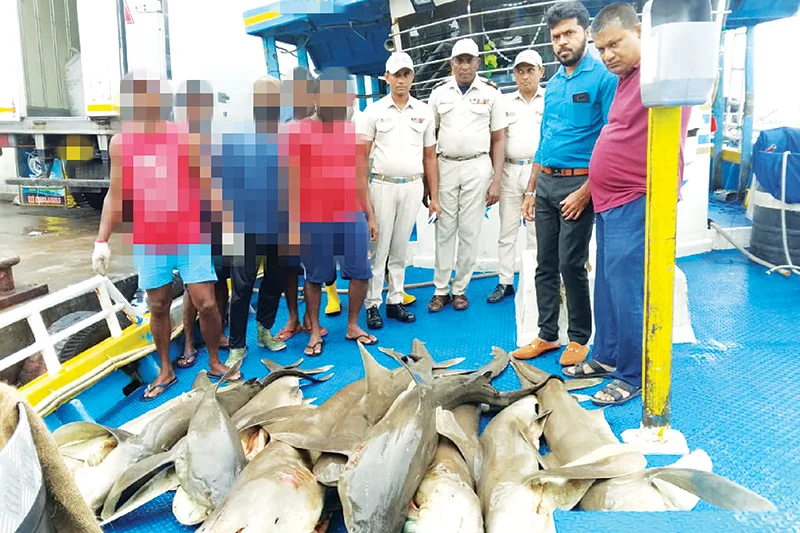 Six suspects were arrested along with 850 kg of illegally harvested shark flesh concealed inside their multi-day fishing vessel, a senior SL Coast Guard spokesman said.