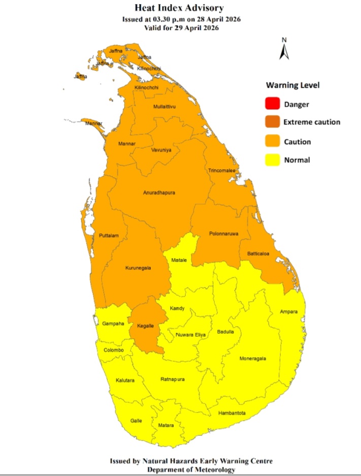 The Heat index, the temperature felt on human body is likely to increase up to ‘Caution level’ at some places in the Northern, North-central and North-western provinces and in Kegalle,