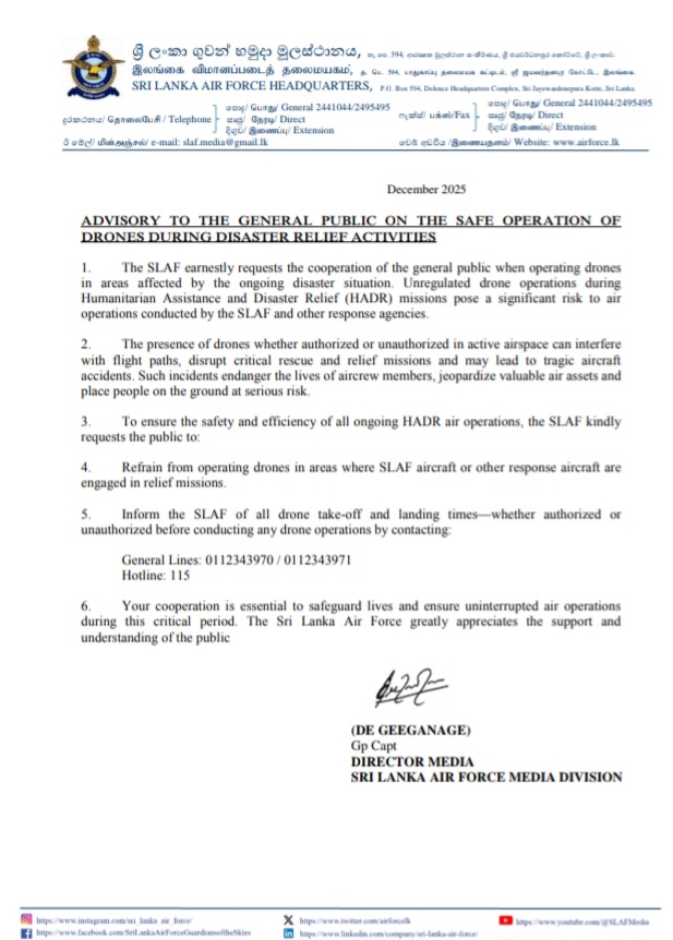 The Sri Lanka Air Force has issued an advisory requesting the corporation of the public when operating drones in area where disaster relief activities are taking place.