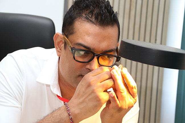 Milinda Edirisinghe performs a sensory inspection of a gemstone using a loupe to assess its initial characteristics