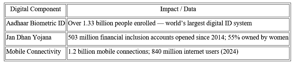 The integration of Aadhaar + Mobile + Bank accounts (the JAM Trinity) has enabled universal identity verification, digital KYC, and seamless delivery of welfare benefits.