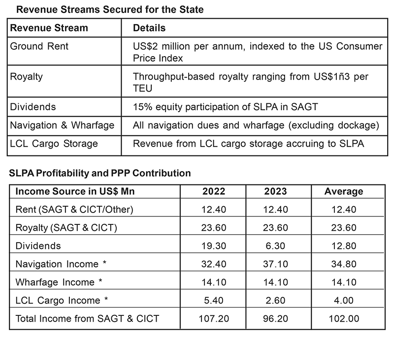 The above analysis demonstrates that SAGT- and CICT-related operations contribute over US$100 million annually to SLPA, accounting for the bulk of its profitability. In contrast, the remainder of SLPA’s operations generate significantly lower returns, underscoring the strategic importance of well-structured PPPs.