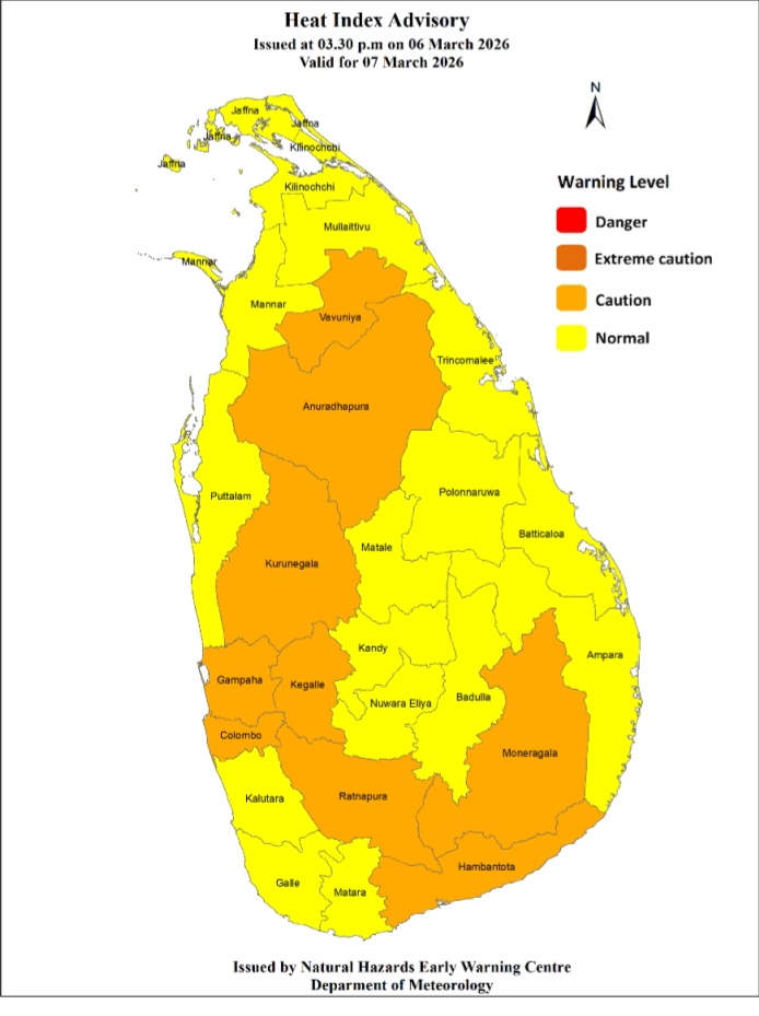 The public are warned that the Heat index, the temperature felt on human body is likely to increase up to ‘Caution level’ at some places in the Sabaragamuwa province and in Colombo, Gampaha, Kurunegala, Anuradhapura, Vavuniya, Hambantota and Monaragala districts.