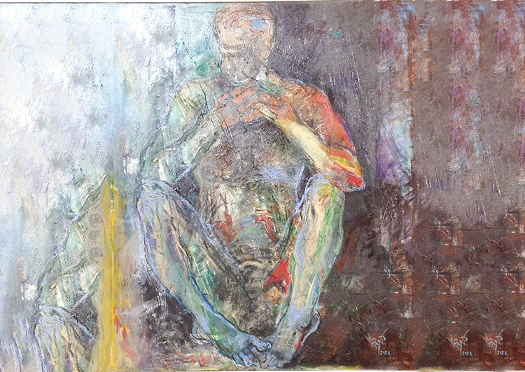 I was predisposed to notice the function of the big toe in Rodin’s modern sculpture, The Thinker (1904) and in Sarath Chandrajeewa’s painting, Thinker in front of the empty doorway (2023), because of a photo of a big toe in the book, Gesture and Speech by the palaeo-anthropologist Andre Leroi-Gourhan. In extreme close-up, it is not a pretty picture, though what Leroi-Gourhan has to say about its function in human evolution is startling, certainly food for thought. He says that the evolution of the human foot with its big toe created the bipedal ability to stand up firmly, and walk upright, without losing balance.