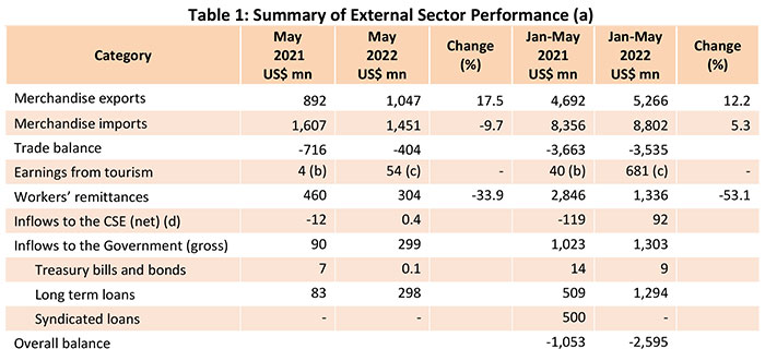 The import expenditure declined, while earnings from exports increased in May 2022, year-on-year, extending the contraction in the trade deficit for the third consecutive month. Meanwhile, tourist arrivals slowed in May 2022, compared to the previous month. Workers’ remittances increased in May 2022, compared to April 2022.