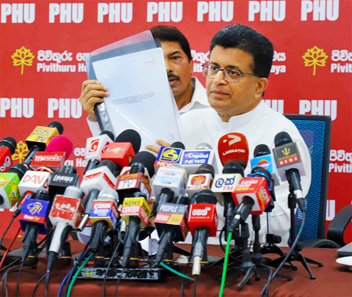 PHU leader Udaya Gammanpila, at yesterday’s media conference, criticising the NPP government for its refusal to release two presidential committee reports on the Easter Sunday attacks. (pic courtesy PHU)