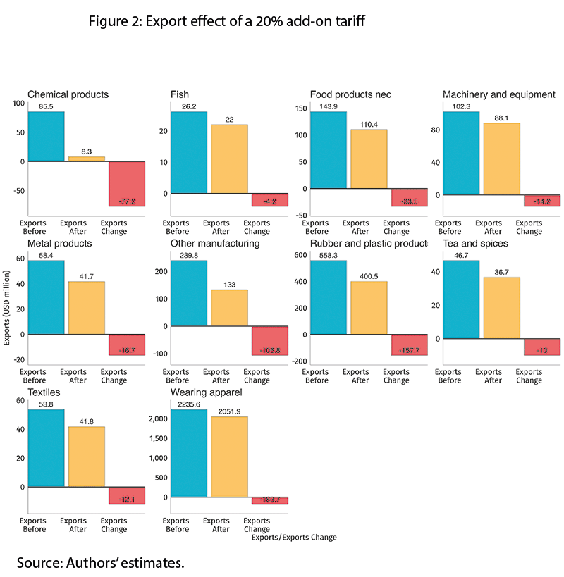According to the estimates, the proposed tariffs will severely impact Sri Lanka’s exports of rubber and plastic products, as well as other manufactured products like Christmas decorations, brooms and brushes (Figure 2).