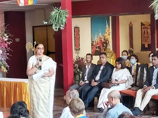 The statement said: “The event commenced with a procession displaying Buddhist Relics, flags accompanied by traditional music and offering of flowers to Lord Buddha. Moving on with the programme, religious observances in Theravada and Mahayana were conducted. The event consisted of a sermon from Ven. Chandrarathana on Vesak Day and its objectives in today’s context, an address by Prof. Kshanika Hirimburegama, Ambassador of Sri Lanka to the French Republic, highlighting the importance of Vesak Day to all the Buddhists around the world including Sri Lanka, Thailand, Vietnam Cambodia and Laos, and finally the event was concluded with a meditation programme conducted by Alain Durel on ‘the four noble truths and the eight paths’.Maha Sanga from Sri Lankan, Vietnamese, Chinese, Thai, and Taiwanese temples in Paris, officials of the Embassy of Sri Lanka and devotees from the different Buddhist communities were in attendance to commemorate this important day.”
