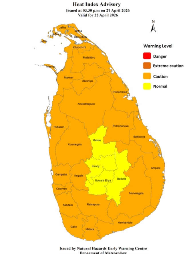 Thundershowers accompanied with severe lightning are likely to occur in the Western, Sabaragamuwa, Central, North-western, Northcentral, Southern, Uva provinces, and in Mannar, Vavuniya, Ampara, Batticaloa districts after 1.00 p.m.