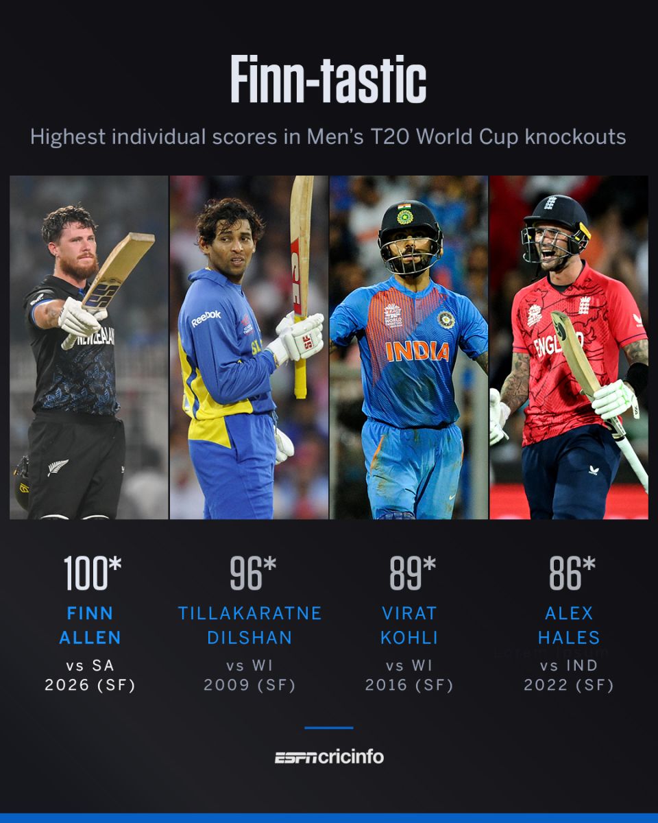 It was Seifert who had made the early running, contributing 41 of the 62 New Zealand had scored in the first five overs of their chase. In the final over of the powerplay, Allen carted Bosch for a sequence of 6,4,4,4,4 as New Zealand finished with 84 for 0. It was the second-highest powerplay score in this T20 World Cup and the highest powerplay score across all knockout games in the T20 World Cup.
