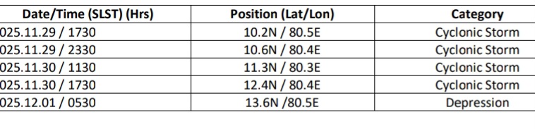 The Cyclonic Storm “Ditwah” [Pronunciation: Ditwah] is centered near latitude 9.9°N and longitude 80.7°E, about 80km Northeast of Jaffna, and it is very likely to move north-north-westwards. (Cyclone track details attached.)